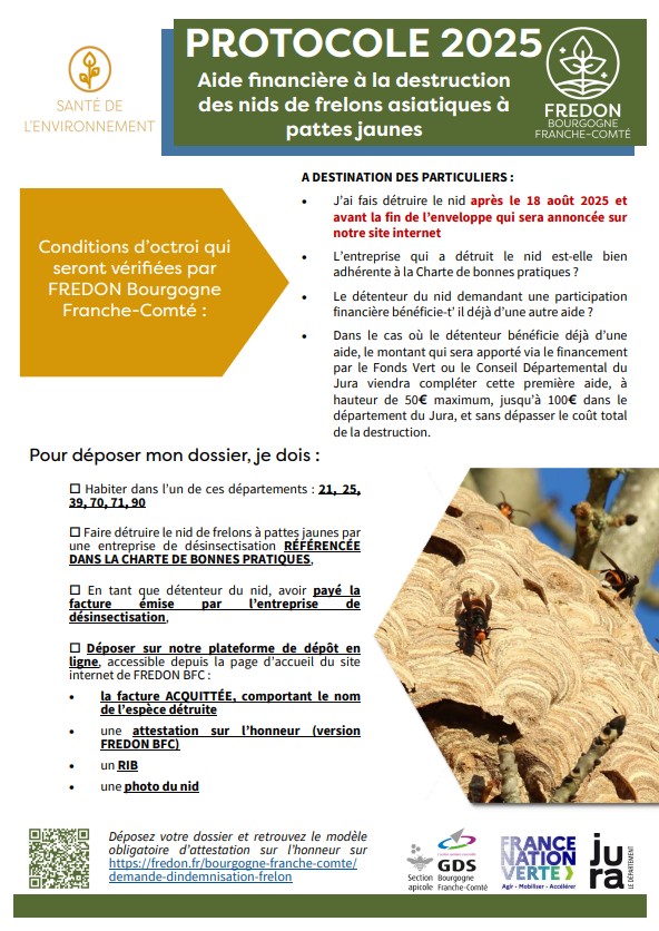 2024 : Grâce à la mise en place d’un partenariat entre les Organismes à Vocation Sanitaire dans le domaine animal (GDS BFC) et végétal (FREDON BFC), et au concours financier du gouvernement via le Fonds Vert, un plan de lutte régional contre le frelon asiatique à pattes jaunes a pu être déployé sur une grande partie de la région BFC en 2024.