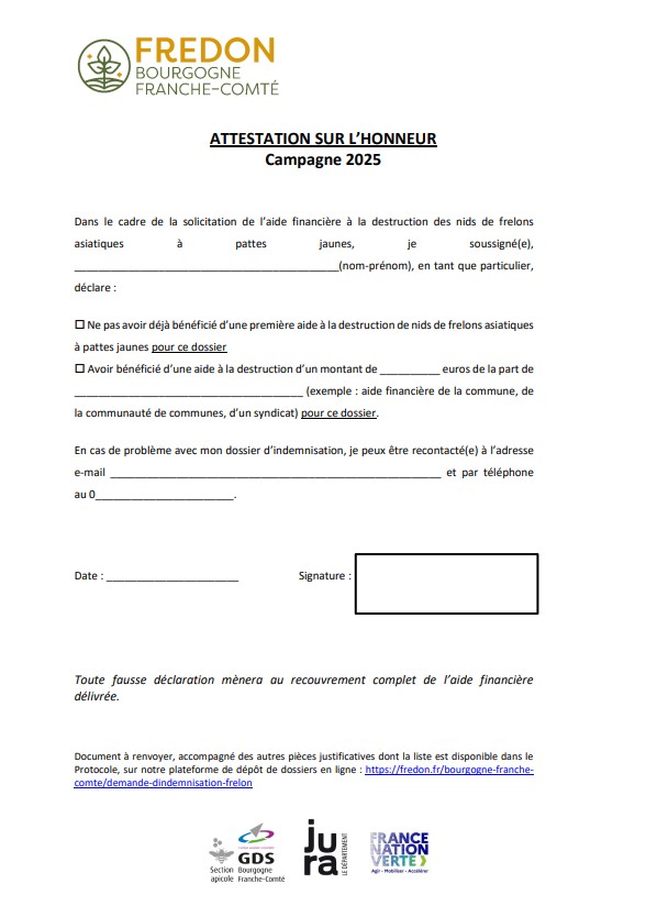 Pour déposer une demande d'indemnisation d'une destruction de nid de frelon à pattes jaunes réalisées à partir du 19/08/2025, cliquez ici !