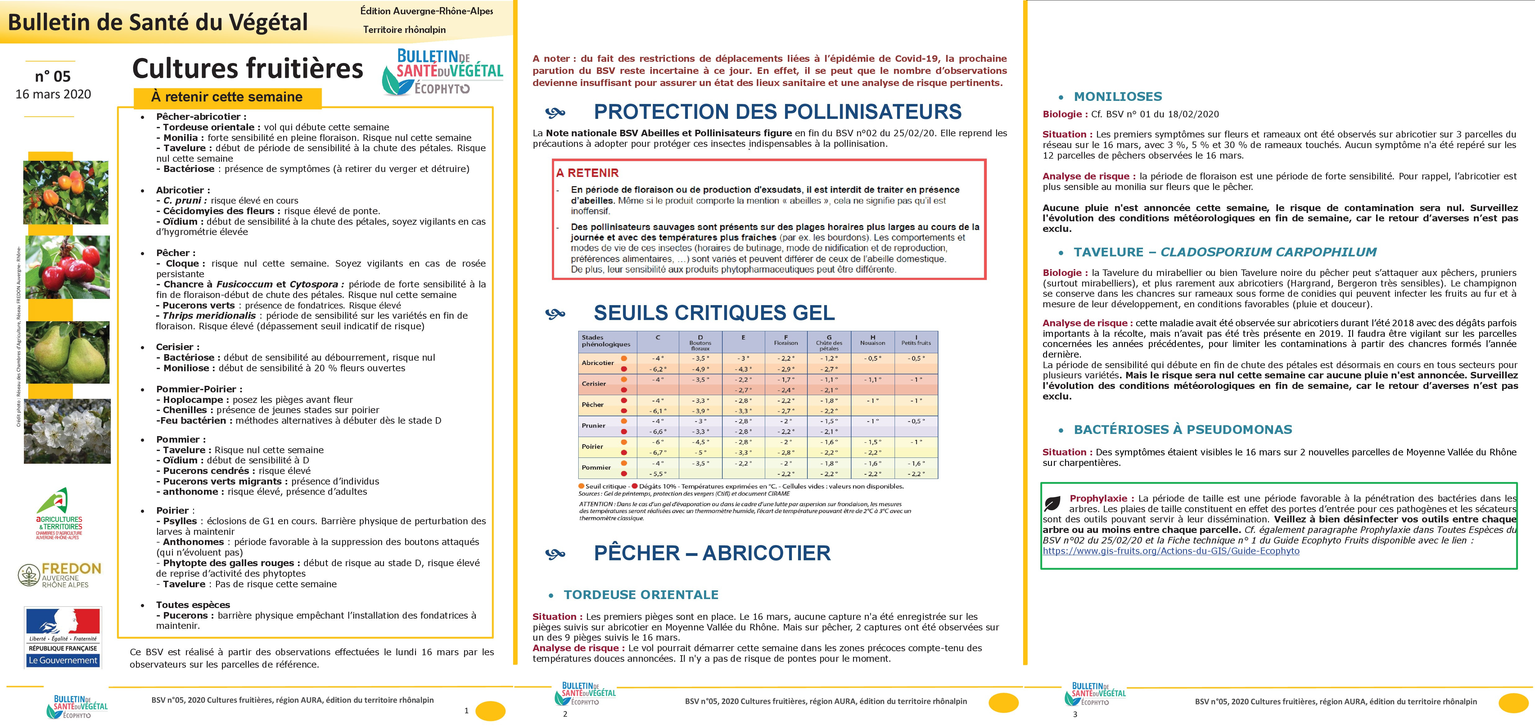 A cette fin, FREDON Auvergne Rhône-Alpes est impliquée dans l’élaboration des Bulletins de Santé du Végétal (BSV), soit par la réalisation d’observations, soit par la rédaction des bulletins (synthèse des données, analyse de risque, et/ou relecture et validation) sous la responsabilité de la Chambre Régionale d’Agriculture.